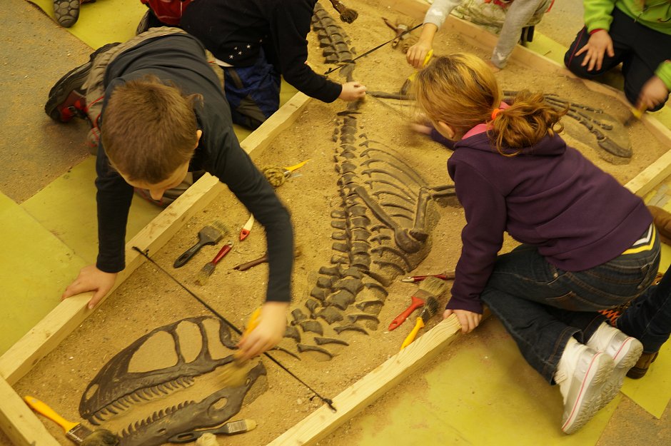 Komentované muzejní expozice se přesunete do našich dílen! Tam si váš potomek nabarví dvaceticentimetrovou lebku dinosaura, odkryje kostru raptora v životní velikosti, zkusí práci s preparačním zařízením, vytvoří si malý odlitek z naší kolekce forem.