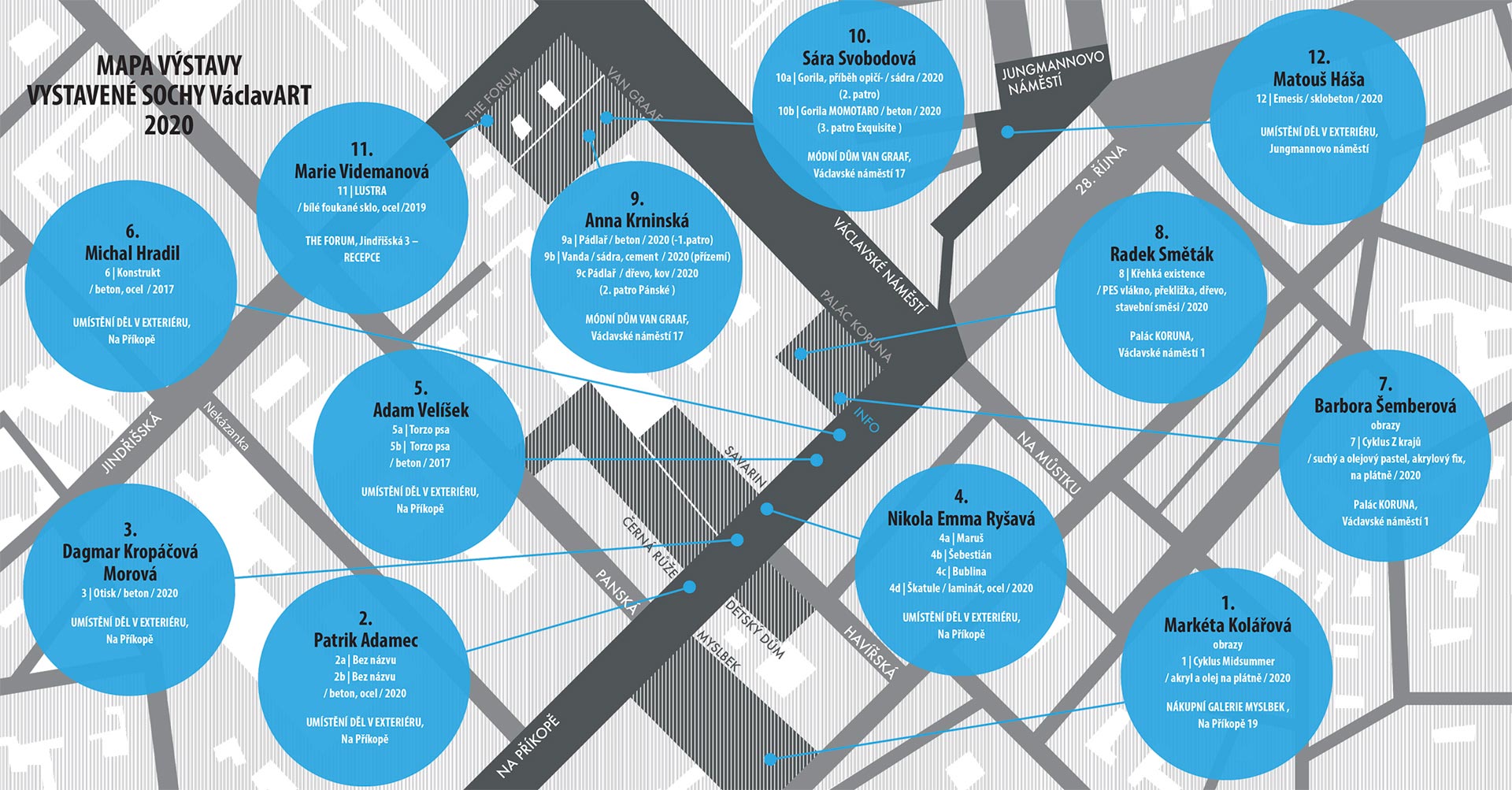 Příkopy, Galerie Myslbek, Palác Koruna, VAN GRAAF, The Forum, Jungmanovo náměstí