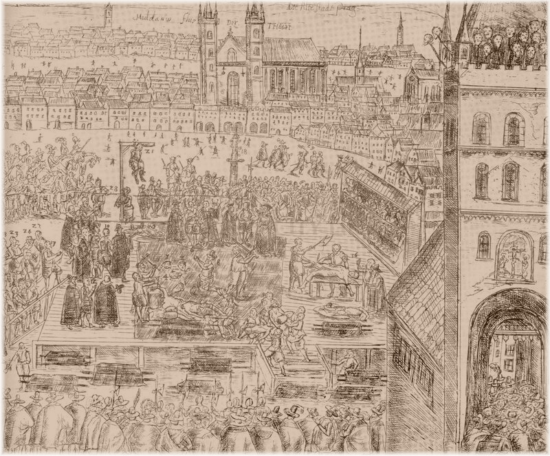 Před Staroměstskou radnici byl popraven například Jáchym Ondřej Šlik, Václav Budovec z Budova, Kryštof Harant z Polžic a Bezdružic, Diviš Černín z Chudenic, Ján Jesenský z Jesenova a další. Poprava se konala dne 21. června 1621. Provedl ji kat Jan Mydlář, který odsouzencům uťal hlavy mečem. Pro tuto příležitost měl připraveny čtyři meče, kdy na každý z nich následně vyryl jména těch, které pod jeho čepelí zemřeli. Těla popravených byla následně předána rodinám, dvanáct hlav však bylo pro výstrahu všem vystaveno na Staroměstské mostecké věži. Zde byly umístěny až do roku 1631. Vraťme se ale zpět na Staroměstské náměstí. Místo popravy zde připomínají dlažební kostky ve tvaru sedmadvaceti bílých křížů nedaleko Staroměstské radnice. Jen díky tomu se máte možnost představit, jak to asi na Staroměstském náměstív roce 1621 vypadalo, a kde přesně bylo popraviště umístěno