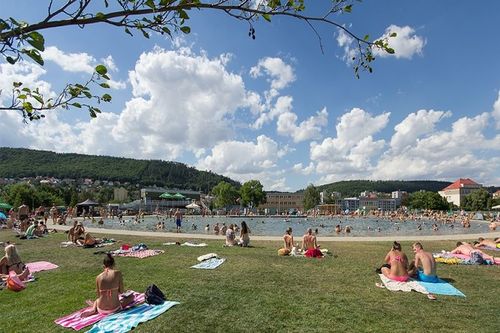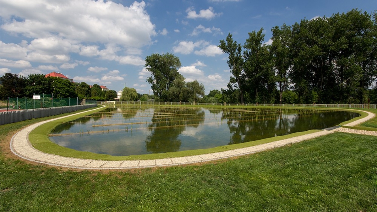 má půdorysné rozměry 80,0 x 30,0 m, hloubky 0,25 m — 0,85 m. Nachází se v severovýchodní části areálu. Koupací část a vegetační zóny jsou propojeny v cirkulačním systému. V průběhu užívání se doplňuje pouze výpar. Biologické čištění probíhá v lemových zónách, v biologické části gravitačním způsobem. Vše je zaústěno zpět do nádrže. Z nádrže je tedy odváděna voda, následně přečerpávána na nejvyšší část přes gravitační filtr do biologické části a zde gravitačně stéká přes filtrační substrát zpět do bazénu.