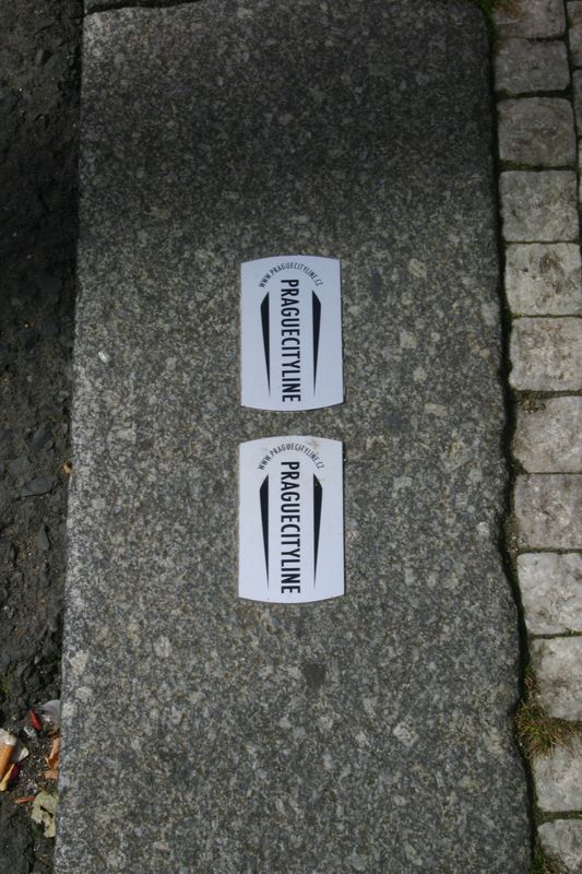 b) Kruhové značky – upozorňují na památku. Na kruhové značce je číslo, které odpovídá číslu památky v tištěném průvodci a nebo památce na webových stránkách praguecityline.cz.