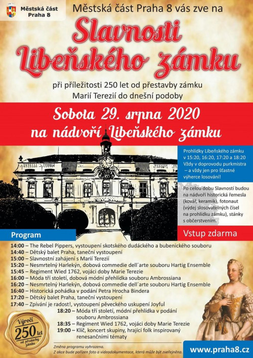 Slavnosti Libeňského zámku při příležitosti 250 let od přestavby zámku Marií Terezií do dnešní podoby.Prohlídky Libeňského zámku v 15.20, 16.20, 17.20 a 18.20 hodin. Vždy v doprovodu purkmistra a vždy jen pro šťastné výherce losování.Po celou dobu Slavností budou na nádvoří historická řemesla (kovář, keramik), fotonaut (výdej slosovatelných čísel na prohlídku zámku), stánky s občerstvením.