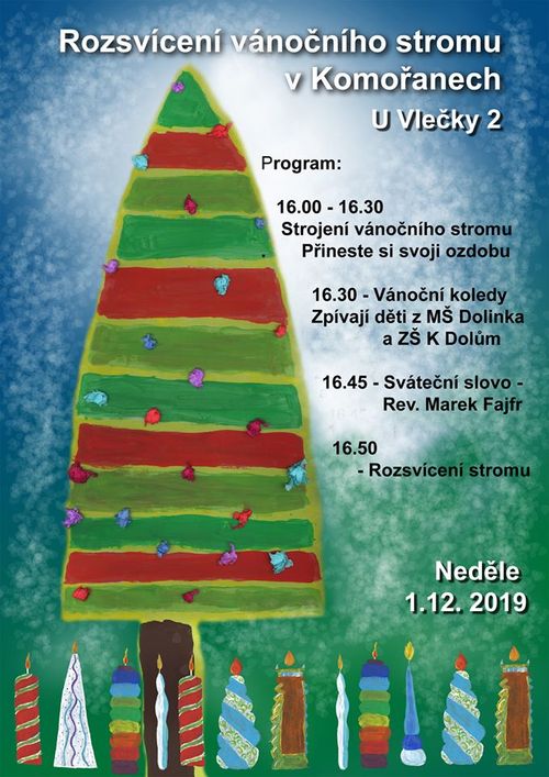 V ulici U Vlečky v Komořanech se rozsvítí vánoční strom přesně o první neděli adventní, tedy 1. prosince v 16:50 hodin. S neopakovatelnou chvílí bude spojeno strojení vánočního stromu (každý si může přinést svoji ozdobu), zpívání vánočních koled v podání dětí z MŠ Dolinka a ZŠ K Dolům a sváteční slovo reverenda Marka Fajfra.