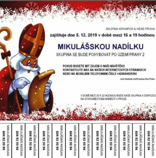 Mikulášská nadílka s naší skupinou.Skupina se bude v době od 16 hodin do 19.30 hodin pohybovat po oblasti Prahy 2 a následně se přesune na Staroměstské náměstí kde se bude nacházet v době mezi 20 hodinou a 22 hodinou.