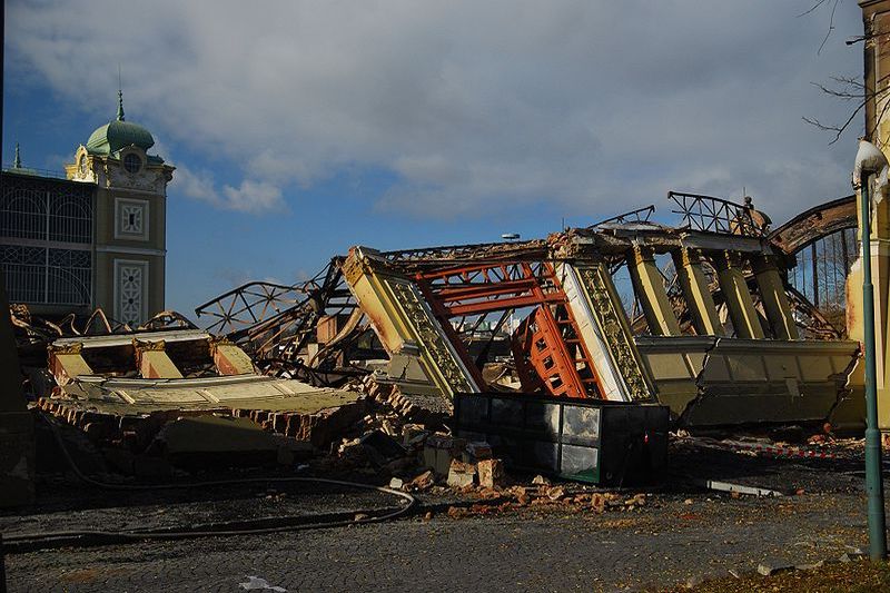 Dostalo ale druhou ránu, 16. října 2008 lehlo nenávratně popelem celé levé křídlo Průmyslového paláce. Tam kam nemohla voda dokončil dílo zkázy požár. Znovu vznikly obrovské škody na majetku i stavbě, kde ztráty byly nejen finanční, ale i nedocenitelné historicky, protože v ohni padlo stavitelské umělecké dílo. Záměr Průmyslový palác obnovit je zřejmý, ale náklady budou obrovské. V současné době je všechno otázka budoucnosti a dostatku finančních zdrojů. Můžeme jen doufat, že bude všechno dovedeno do zdárného konce a dílo se podaří.
