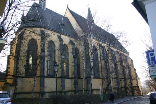 Kostel stojí na návrší, kterému se historicky říkalo Větrov. Je jednolodní gotickou bazilikou, která byla vybudování mezi lety 1362 – 1390 z rozhodnutí císaře Karla IV. pro kapitulu přenesenou sem ze Sadské. Při chrámu stála škola, kde v předvečer své smrti za husitských bouří roku 1419 pobýval Václav IV. se svým dvorem. V roce 1420 se tato místa stala přístřeškem pro východočeské Orebity, kteří obléhali Vyšehrad a byla téměř vypleněna. Dodnes se v tomto chrámu zachovaly jen zbytky gotických nástěnných maleb zpodobňující Krista, Madonu a apoštoly z konce 14. století. V interiéru také najdeme mnohé barokní památky, které sem byly přeneseny ze zrušeného kláštera na Karlově. Mimo jiné i zázračný obraz, namalovaný roku 1697 Janem Jiřím Heinschem, vyobrazující Pannu Marii Karlovarskou, která je patronkou těhotných žen. V letech 1893 – 1898 byl chrám regotizován architektem Josefem Mockerem.