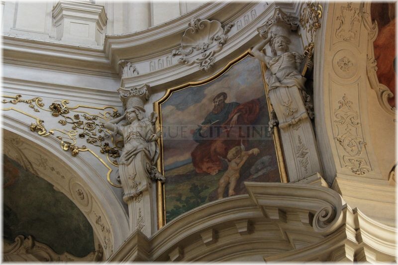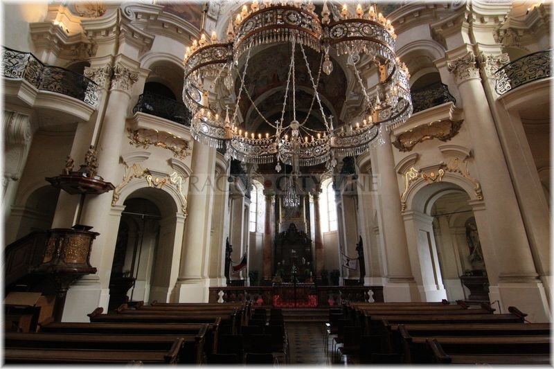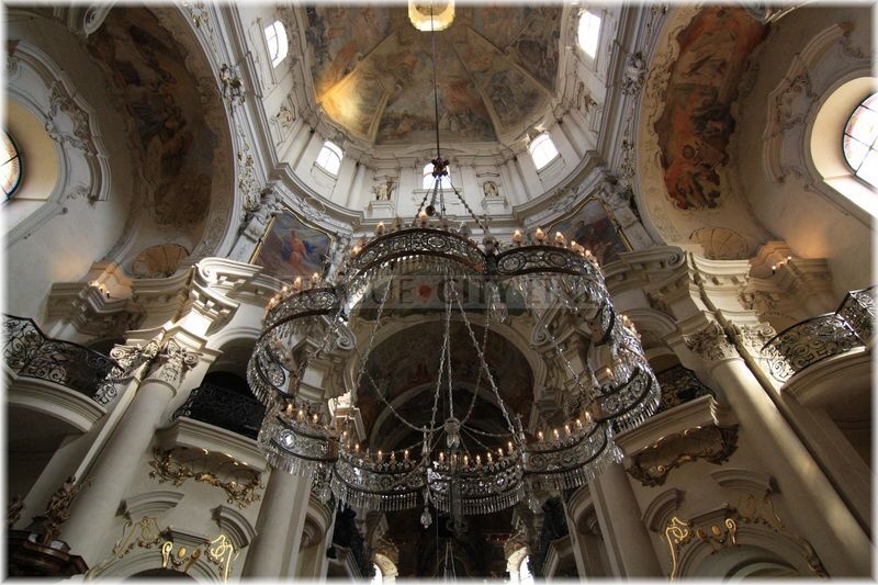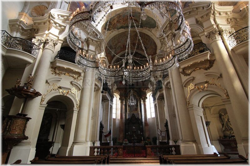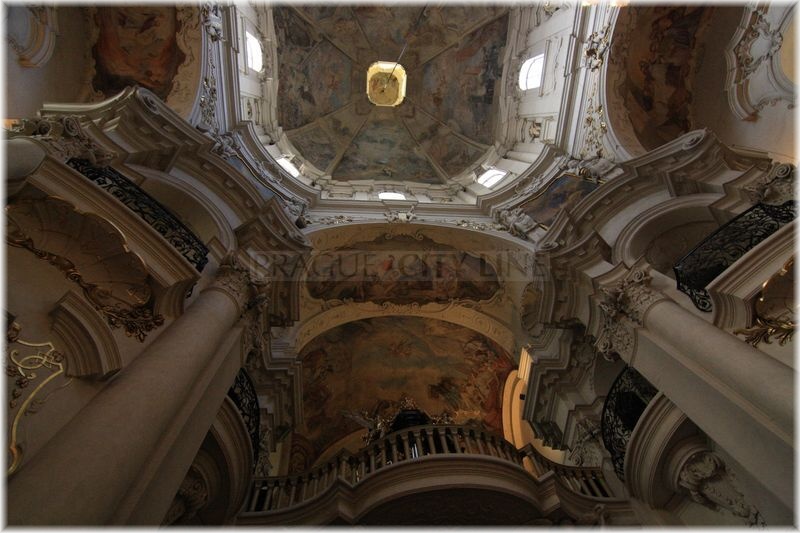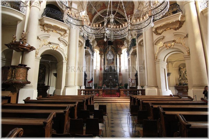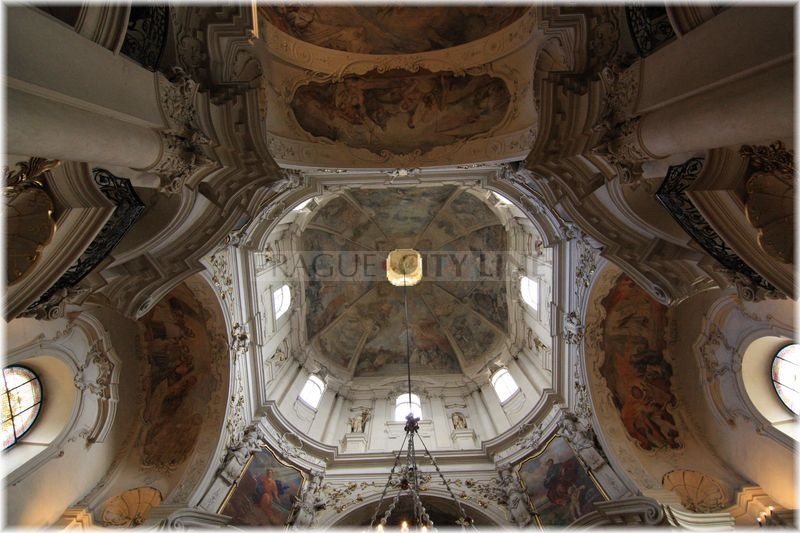 Vnitřek chrámu je zdoben bohatou štukaturou od Bernarda Spinettiho. Autorem maleb v kupoli, kněžišti a bočních kaplích je Petr Assamo. Tyto malby představují výjevy ze života sv. Mikuláše a sv. Benedikta. Jistě si zde také všimnete obrovského korunového lustru daru od cara Mikuláše II.