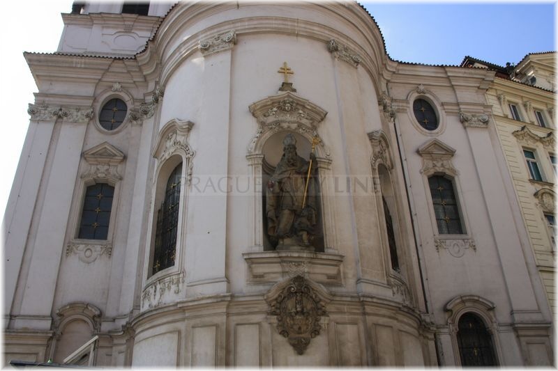 Vstupní průčelí tohoto chrámu bylo obráceno směrem k Židovskému Městu, a nemuselo proto být nijak výrazně vyzdobeno. Naproti tomu chrámový bok se obrací přímo k Staroměstské radnici. Proto je boční průčelí bohatě zdobeno a vzbuzuje dojem, že se jedná o hlavní vchod. Výzdoba této boční fasády byla koncipována pro pohled zblízka, jak je patrné ze sklonu soch zde umístěných, které vytvořil Antonín Braun.