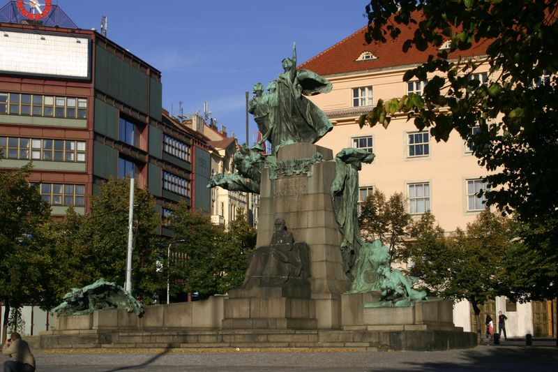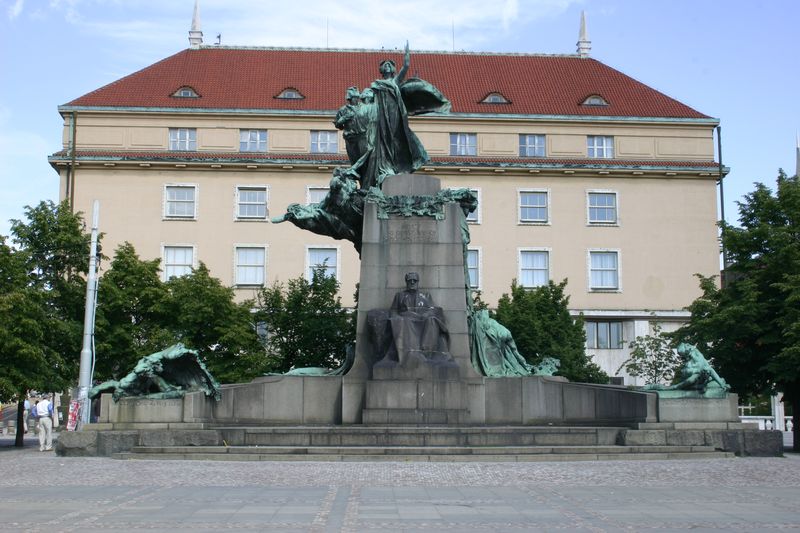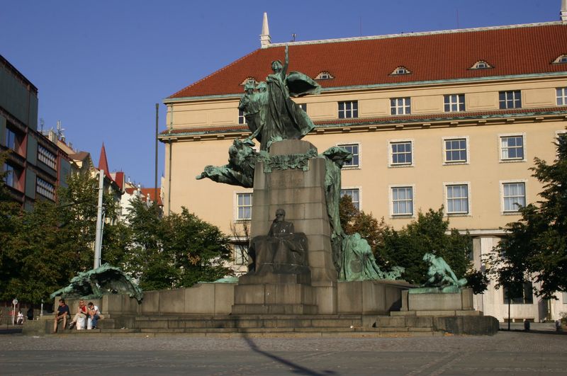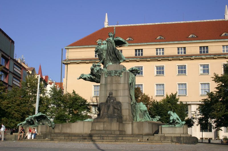 Monumentální sousoší bylo vytvořeno ve spolupráci sochařů Stanislava Suchardy, Aloise Dryáka a Josefa Mařatky v letech 1898 – 1902. Je umístěno na předmostí k Palackého mostu.