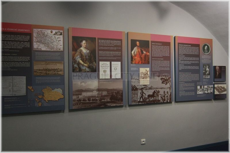 Muzejní expozice je jedinou výstavou v České republice, která kompletně zachycuje dějiny školství a vzdělanosti. Zaměřuje se na období od středověku až po současnost. Sbírky jsou složeny z množství obrazů, map, fotografií. Výstava je rozdělena celkem na dvanáct částí, které pojednávají o počátcích křesťanské vzdělanosti, vzniku pražské univerzity, zlatém věku humanismu, období baroka, nebo o období od osmnáctého do dvacátého století. Další část je zaměřena na na vzdělávání novodobého národa a vznik první Československé republiky, období totalit, tedy od roku 1938 do roku 1989, a závěrečná část expozice informuje o současném vývoji v oblasti školství.