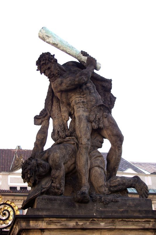 Celá tato nádherná vstupní brána je součástí rokokového mřížoví, které pochází z období vlády Marie Terezie. Nad hlavními vraty nalezneme částečně pozlacený, kovaný oblouk, který doplňuje a vyzdvihuje královská koruna. Po obou stranách se tyčí mohutné pilíře, které na svých bedrech nesou sochy zápasících gigantů, pocházejících z roku 1768. Na ostatních pilířích můžeme spatřit také krásné sochařské práce, ne však tak monumentální. U zmíněných mohutných pilířů stojí vždy příslušníci Hradní stráže. Pokud jste si již prohlédli bránu i stráž, vydejme se společně na první nádvoří.
