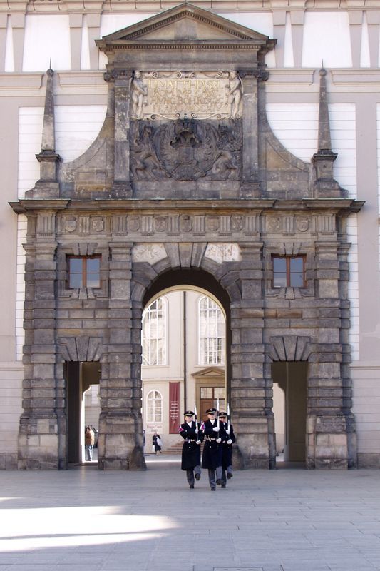 Nutno říci pár slov také o vstupní bráně, vedoucí na druhé nádvoří., neboť právě ona je označována za nejranější barokní dílo na území Čech. Matyášova brána je dílem italského architekta jménem Giovanni Maria Filippi a pochází ze sedmnáctého století. Původně však stála zcela samostatně v prostoru mezi Hradčanským náměstím a Pražských hradem jako antický oblouk, kterým se vcházelo do královského sídla. Název kamenné brány pochází po císaři Matyáši II. Jistě se každý návštěvník pozastaví nad nápisem, nacházejí se ve štítu brány. Ten znázorňuje Matyášův císařský znak a vyjmenovává jeho hodnosti. Pod římsou se nacházejí také znaky jeho zemí. To je zatím ode mne vše, a můžeme postoupit dál.
