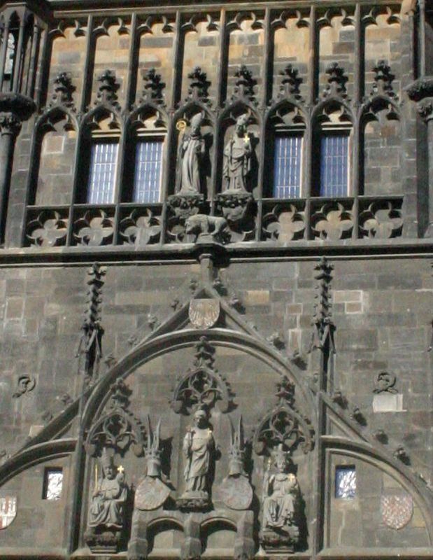 Staroměstská mostecká věž je bohatě plasticky vyzdobena. Na její východní straně můžeme vidět vypodobnění obou panovníků, za jejichž vlády byla věž postavena – vlevo Karel IV. a vpravo Václav IV. Mezi nimi stojí zemští patroni sv. Vít a ještě výš sv. Zikmund a sv. Vojtěch.