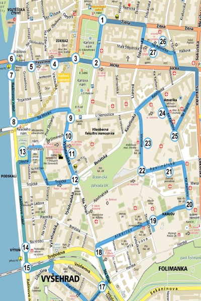 Mapa k turistické trase Prague City Line Praha 2 vás provede po krásách Prahy 2, kde se propojuje dávná středověká historie s novodobými urbanistickými počiny sklonku 19.století.