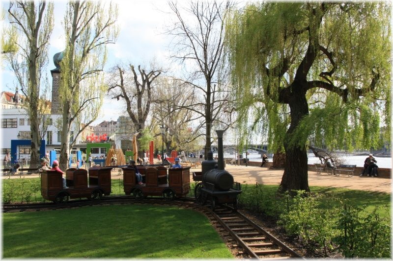 Doporučujeme Vám příjemnou cestu přes Slovanský ostrov. Zejména děti Vám budou vděční.Najdete zde příjemnou restauraci, ale zejména dětský elektrický vláček – Český lvíček. Samozřejmostí je i dětské hřiště. Po chvilce hraní budeme pokračovat dále ostrovem ke stavbě Mánes. Mánes projdeme lávkou nad vodou a dostaneme se zpět na nábřeží.