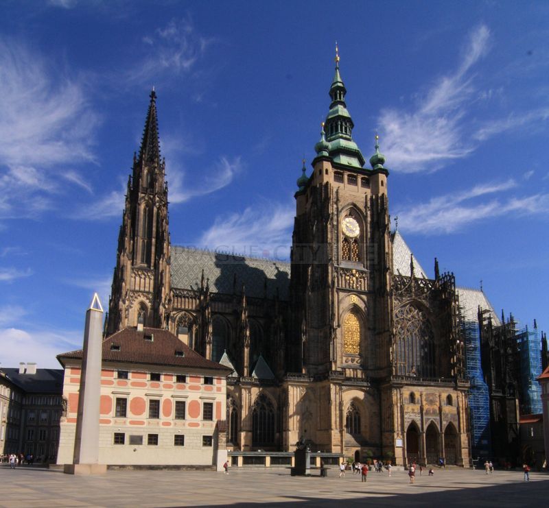 Je to trojlodní gotická katedrála s příčnou lodí, ochozem a věncem kaplí za chórem a s třemi věžemi. Východní část obsahující chór s kaplemi a velkou zvonovou věž je původní stavba gotického období. Západní část – průčelí s věžemi – byla přistavěna v 19. a 20. století. Chrám stojí na místě rotundy z 10. století, nahrazené románskou bazilikou. Byl založen v roce 1344 jako gotická katedrála, budovaná Fracouzem Matyášem z Arrasu do roku 1352 a Petrem Parléřem v letech 1353 až 1399. Chrám byl dostavěn v letech 1873 až 1929 podle projektu a za vedení Josefa Mockera. V chrámu jsou pohřbeni čeští králové. V chrámu si také v době druhé světové války zkoušel české korunovační klenoty zastupující říšský protektor Reinhard Heyndrich. Nic nedbal na legendu o tom, že kdo si korunu a není ji hoden, nasadí, do roka a do dne zemře. Legenda se vyplnila, zanedlouho poté byl zabit českými atentátníky. Hrad je sídlem českého prezidenta.V areálu hradu je možno zakoupit pohled a hned jej také poslat na poště, která je naproti chrámu. Samozřejmostí jsou bankomaty, občerstvení nebo informace. Doporučujeme si celý areál projít a navštívit například Zlatou uličku (GPS: 50°5’31.007″N, 14°24’13.717″E), tedy místo, kde za vlády Rudolfa II. žili řemeslníci a astronomové, když tam budeme mířit, zastavit se můžeme i v bazilice svatého Jiří (GPS: 50°5’28.064″N, 14°24’8.066″E). Doporučujeme fotografovat a fotografovat. Doopravdy to stojí za to.