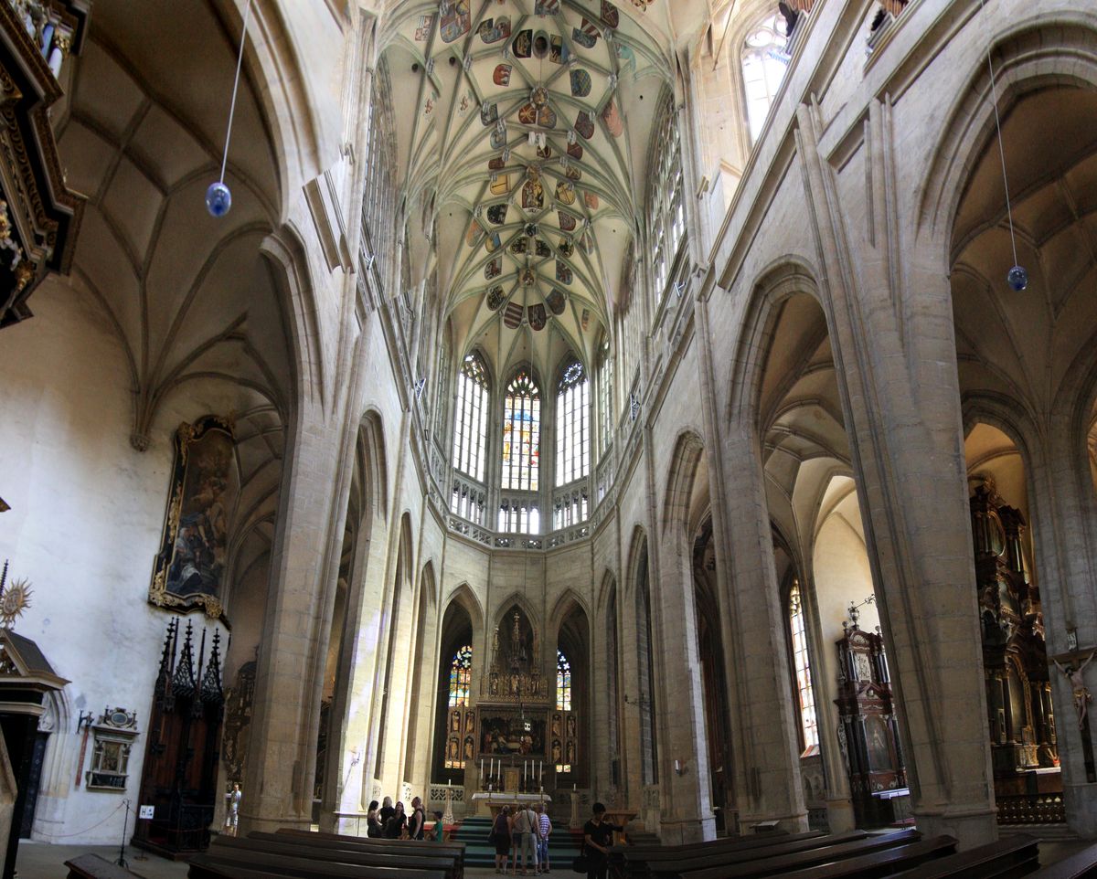 Kromě dechberoucí gotické výzdoby interiéru, tvořené vitrážemi a překrásnými gotickými freskami. Jakmile pohlédnete ke stropu katedrály, čeká na vás okouzlující pohled na mistrně propracovanou síťovou žebrovou klenbu, ve které jsou zasazeny erby mnoha šlechtických rodů. Taková výzdoba chrámu není zcela typická. Věnujme ale pozornost exteriéru památky. Dovede nás k němu alej soch, umístěná na nedalekém mostíku, který byl využíván jako hlavní přístupová cesta.